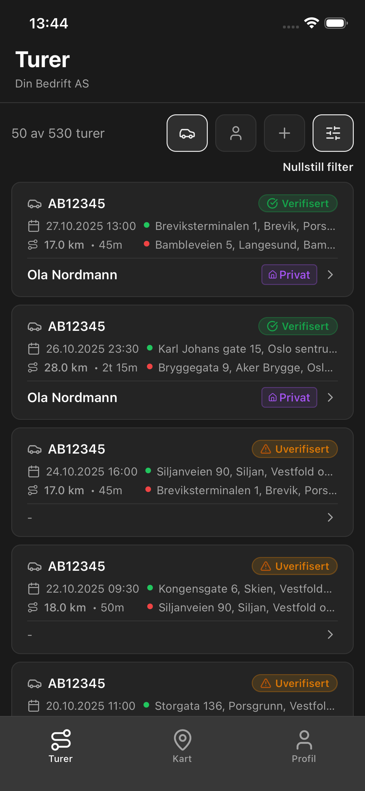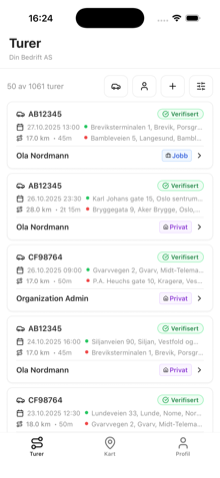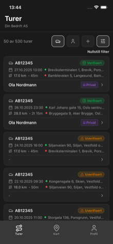 All kjøring logges automatisk. Ingen manuell inntasting eller ekstra utstyr nødvendig.